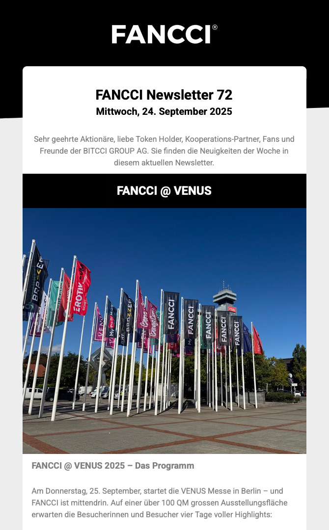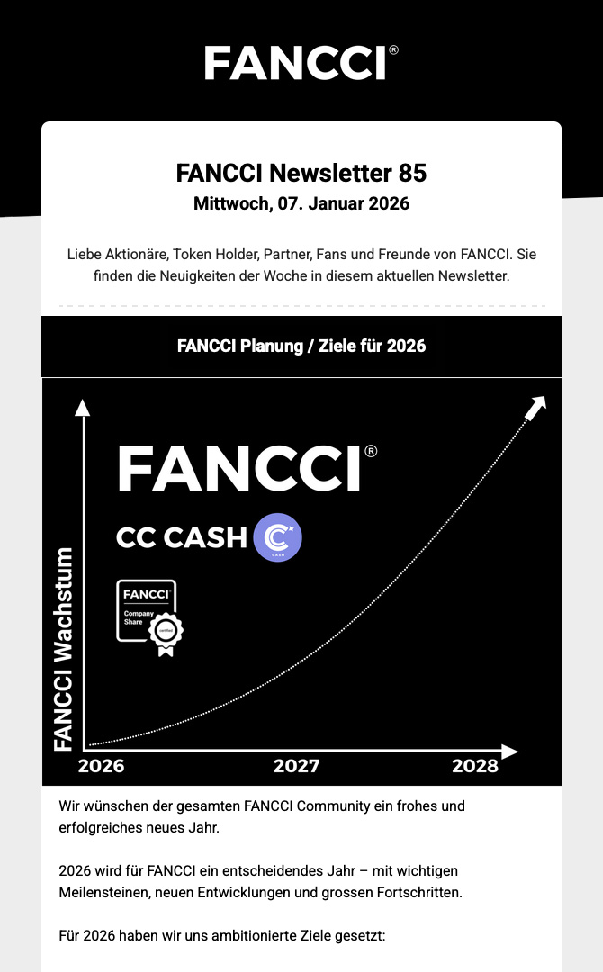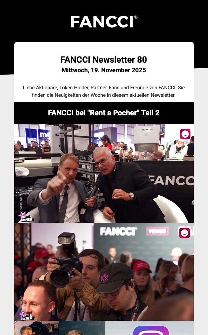 Wenn Sie über unser Unternehmen, die FANCCI Creator Plattform, Innovationen, Events, Messen, Aktien usw. informiert werden möchten, dann melden Sie sich jetzt für unser wöchentliches deutsches Newsletter an. Der FANCCI Newsletter wird jeden Mittwoch um 12 Uhr versendet.