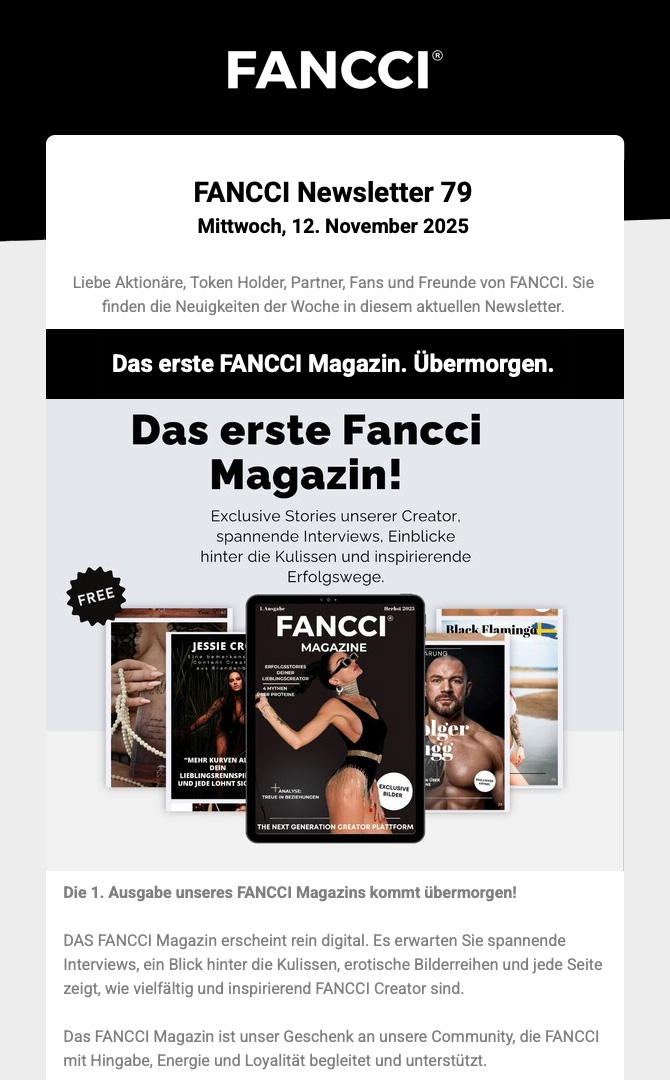 Wenn Sie über unser Unternehmen, die FANCCI Creator Plattform, Innovationen, Events, Messen, Aktien usw. informiert werden möchten, dann melden Sie sich jetzt für unser wöchentliches deutsches Newsletter an. Der FANCCI Newsletter wird jeden Mittwoch um 12 Uhr versendet.