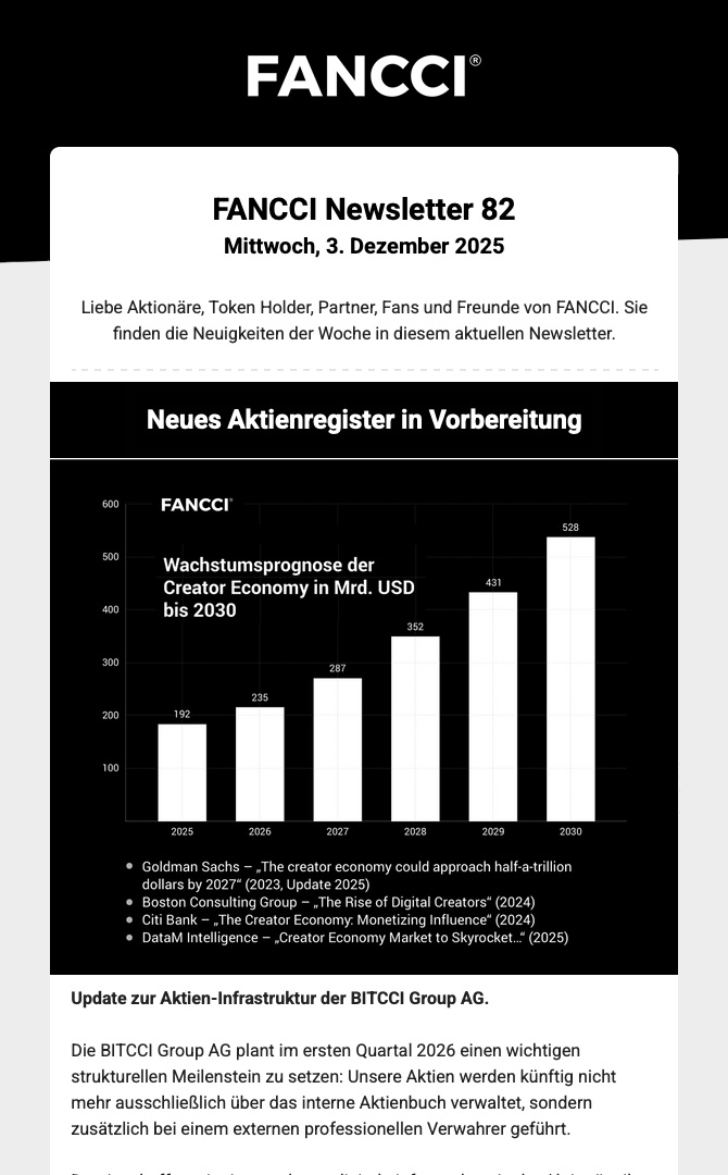 Wenn Sie über unser Unternehmen, die FANCCI Creator Plattform, Innovationen, Events, Messen, Aktien usw. informiert werden möchten, dann melden Sie sich jetzt für unser wöchentliches deutsches Newsletter an. Der FANCCI Newsletter wird jeden Mittwoch um 12 Uhr versendet.